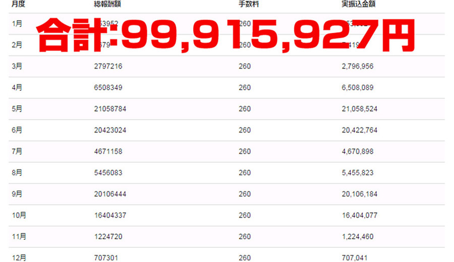 これまでの経験を活かしながら、独自のアフィリエイト手法を模索・実行し、初月の報酬が1,600万円。翌月2013年の6月の報酬が8,000万円。その後は、4,400万円、3,700万円と報酬が入り続け、2013年度の年間報酬額5億円という驚異的な実績を残す。